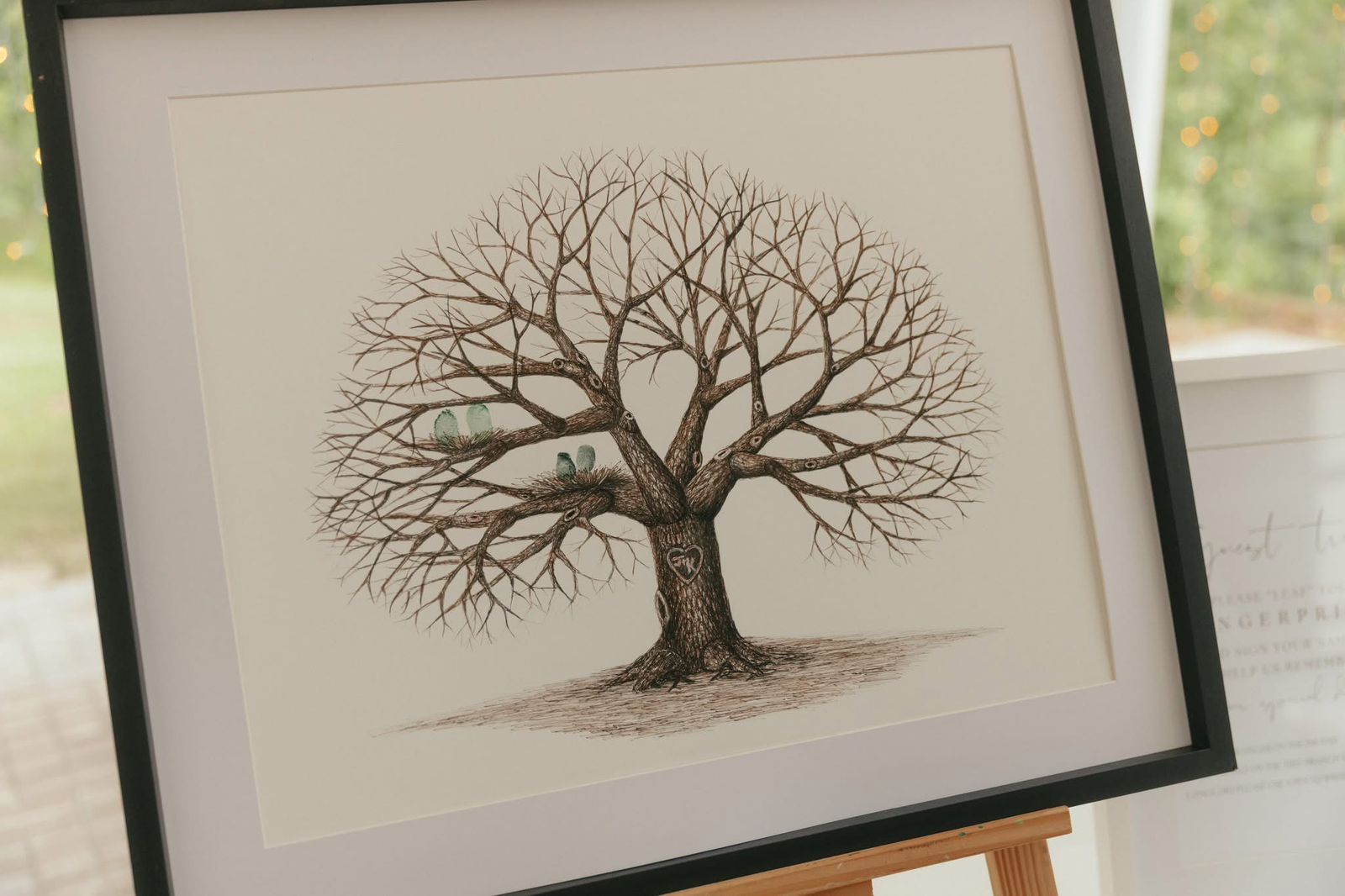 Hand-sketched fingerprint tree reproductions are a unique keepsake that will be cherished for years to come. The drawings are made using Japanese black and white ink on an A2 page. The outcome is a stunning piece of art that perfectly embodies the spirit of the event.