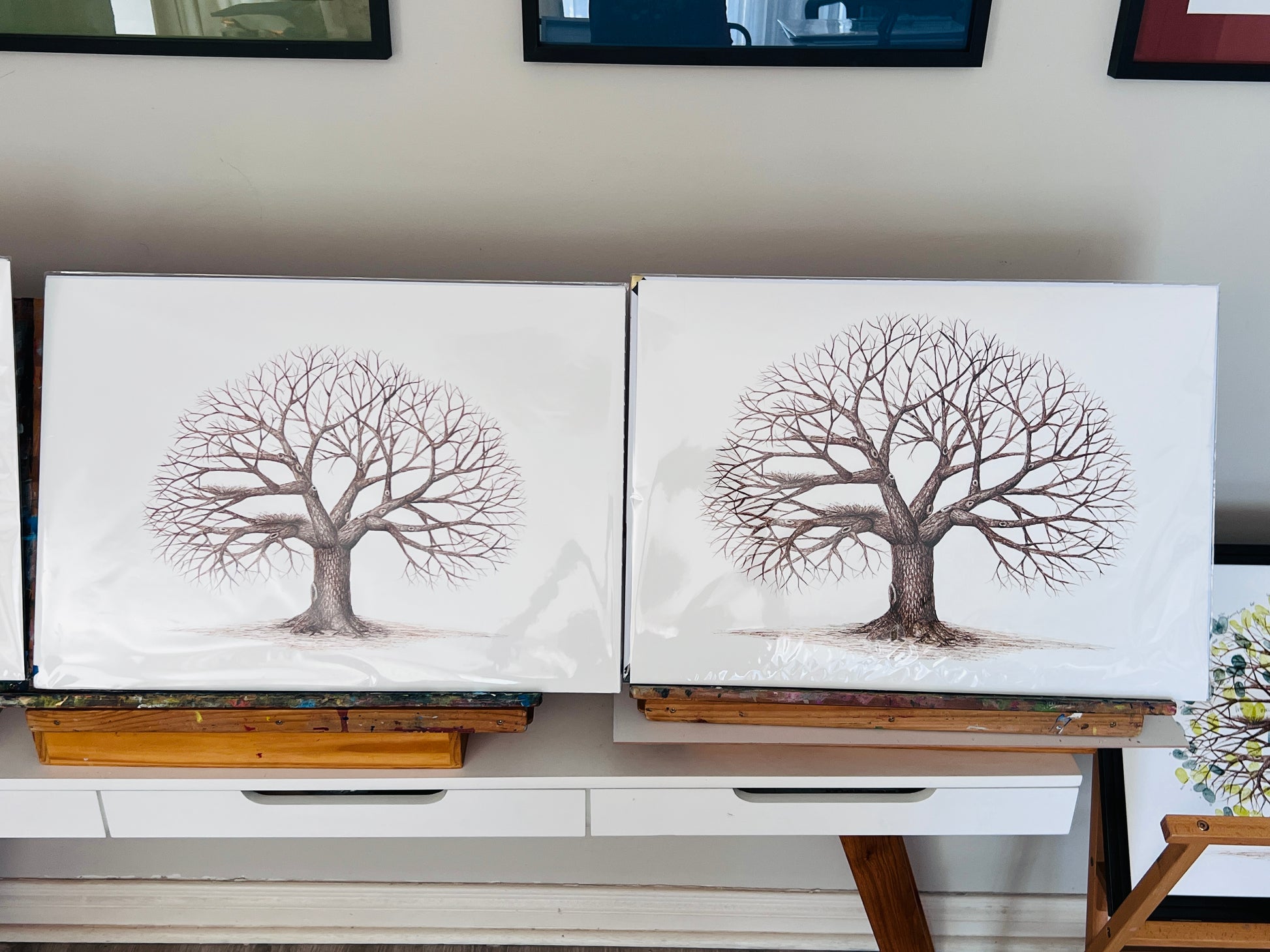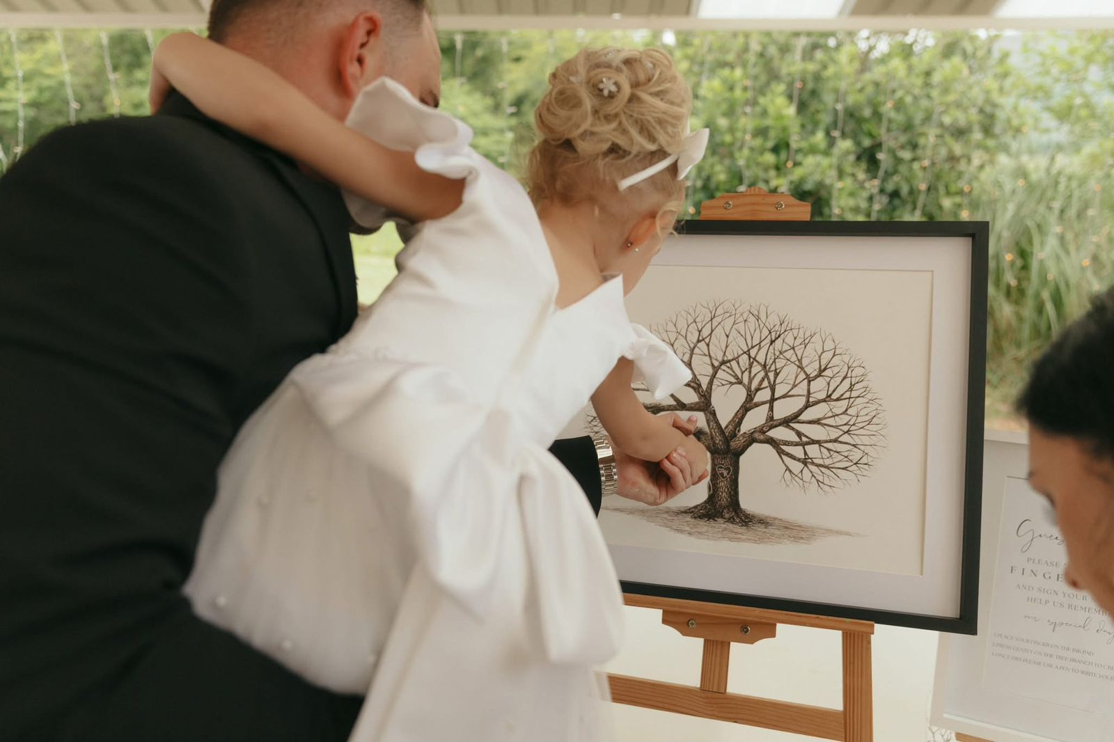 Guests put their fingers on an ink pad and press them onto the page to create the leaves on the tree. The use of fingerprints adds a unique and personal touch to the artwork. Guests can also sign their names next to their thumbprints or fingerprints, further personalising the artwork.