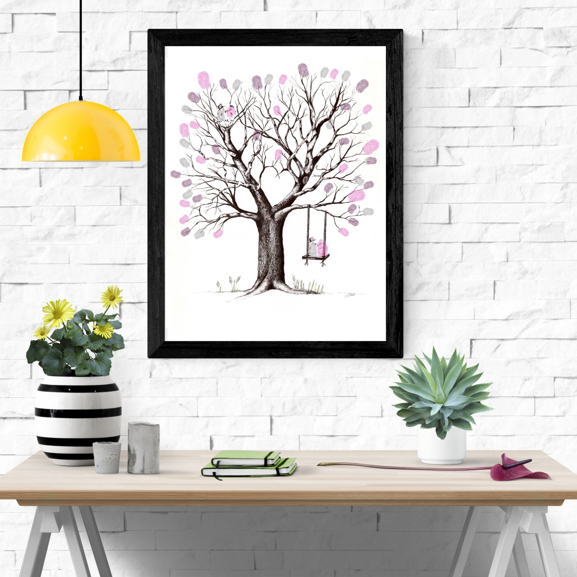 Guests put their fingers on an ink pad and press them onto the page to create the leaves on the tree. The use of fingerprints adds a unique and personal touch to the artwork. Guests can also sign their names next to their thumbprints or fingerprints, further personalising the artwork.