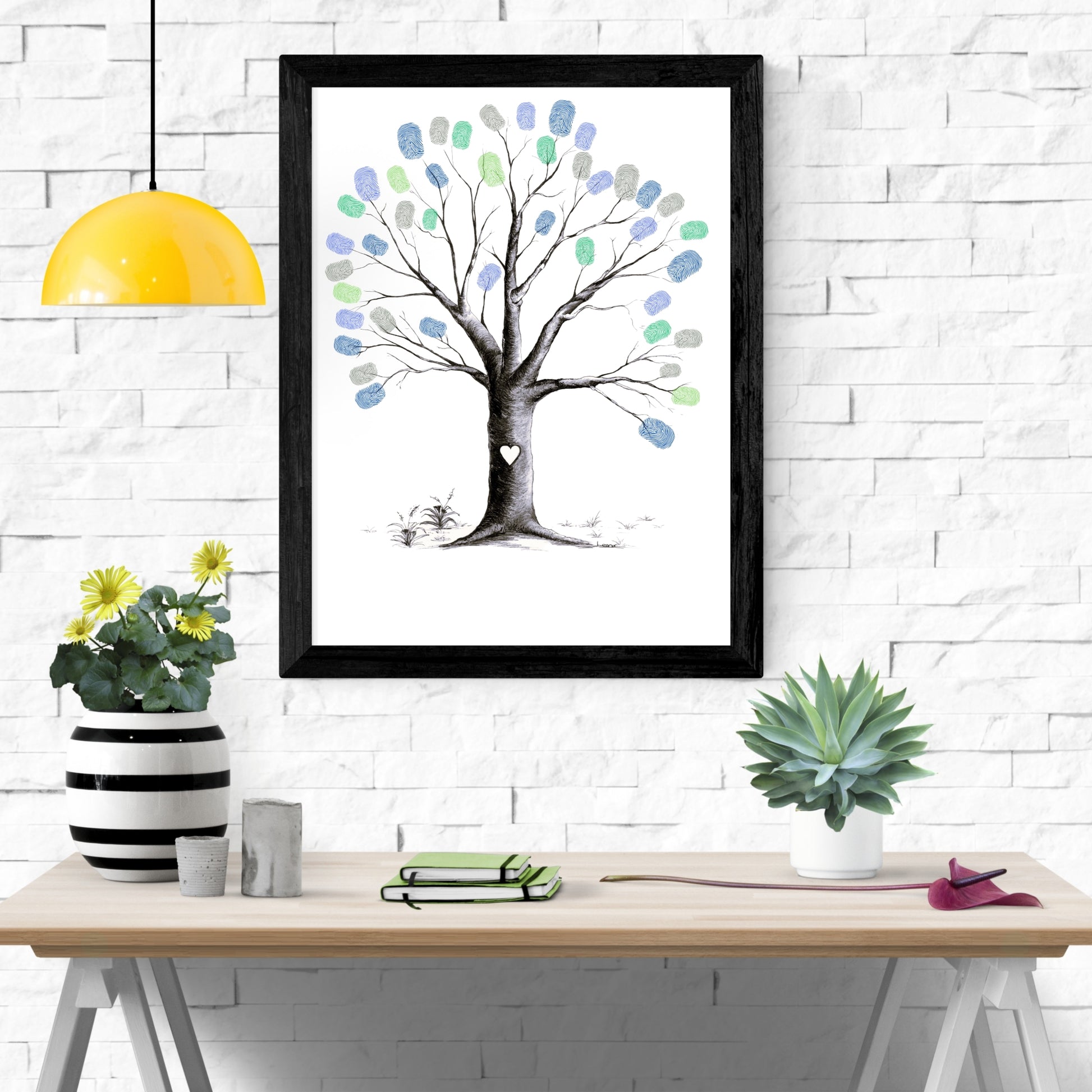 Guests put their fingers on an ink pad and press them onto the page to create the leaves on the tree. The use of fingerprints adds a unique and personal touch to the artwork. Guests can also sign their names next to their thumbprints or fingerprints, further personalising the artwork.